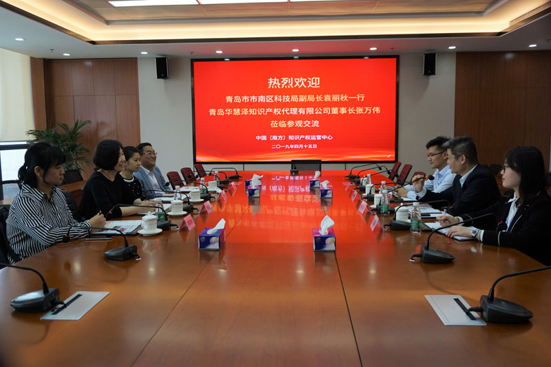 2019年4月15日,青岛市市南区科技局副局长袁丽秋一行到中国(南方)知识产权运营中心参观调研,并与南方中心张卫光副总裁等座谈交流,青岛华慧泽知识产权代理有限公司董事长张万伟一同参加。