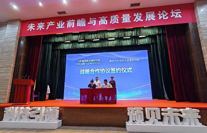 2023年8月28日,青岛市科学技术信息研究院与山东省创新发展研究院科技战略与政策研究中心在“未来产业前瞻与高质量发展”论坛活动上签订战略合作协议。双方将重点聚焦海洋物联网等未来产业系列重大问题和难点问题,创新合作模式,打造交流平台,开展全方位多层次的战略合作。山东省科技厅党组成员、省创发院党组书记、院长刘峰,青岛市科技局党组成员、副局长徐凌云出席见签。
