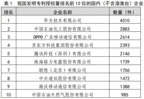在专利方面:2019年,我国发明专利申请量为140.1万件。共授权发明专利45.3万件。其中,国内发明专利授权36.1万件。在国内发明专利授权中,职务发明为34.4万件,占95.4%。2019年,我国发明专利授权量排名前3位的国内(不含港澳台)企业依次为:华为技术有限公司(4510件)、中国石油化工股份有限公司(2883件)、OPPO广东移动通信有限公司(2614件)。
