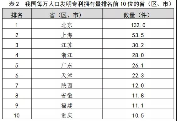 截至2019年底,我国国内(不含港澳台)发明专利拥有量共计186.2万件,每万人口发明专利拥有量达到13.3件,提前完成国家“十三五”规划确定的目标任务。我国每万人口发明专利拥有量排名前3位的省(区、市)依次为:北京(132.0件)、上海(53.5件)、江苏(30.2件)。