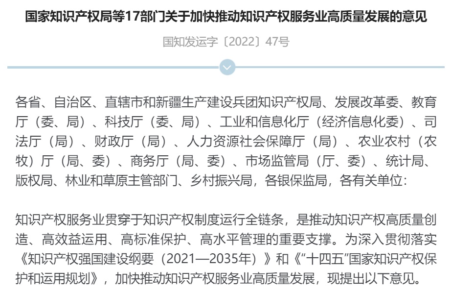 最近国知局发布了《17部门关于推动知识产权服务业高质量发展的意见》,意见涉及到的内容很全面,考虑到知识产权服务业的方方面面。这些意见都是提纲挈领,站在比较宏观的层面。
