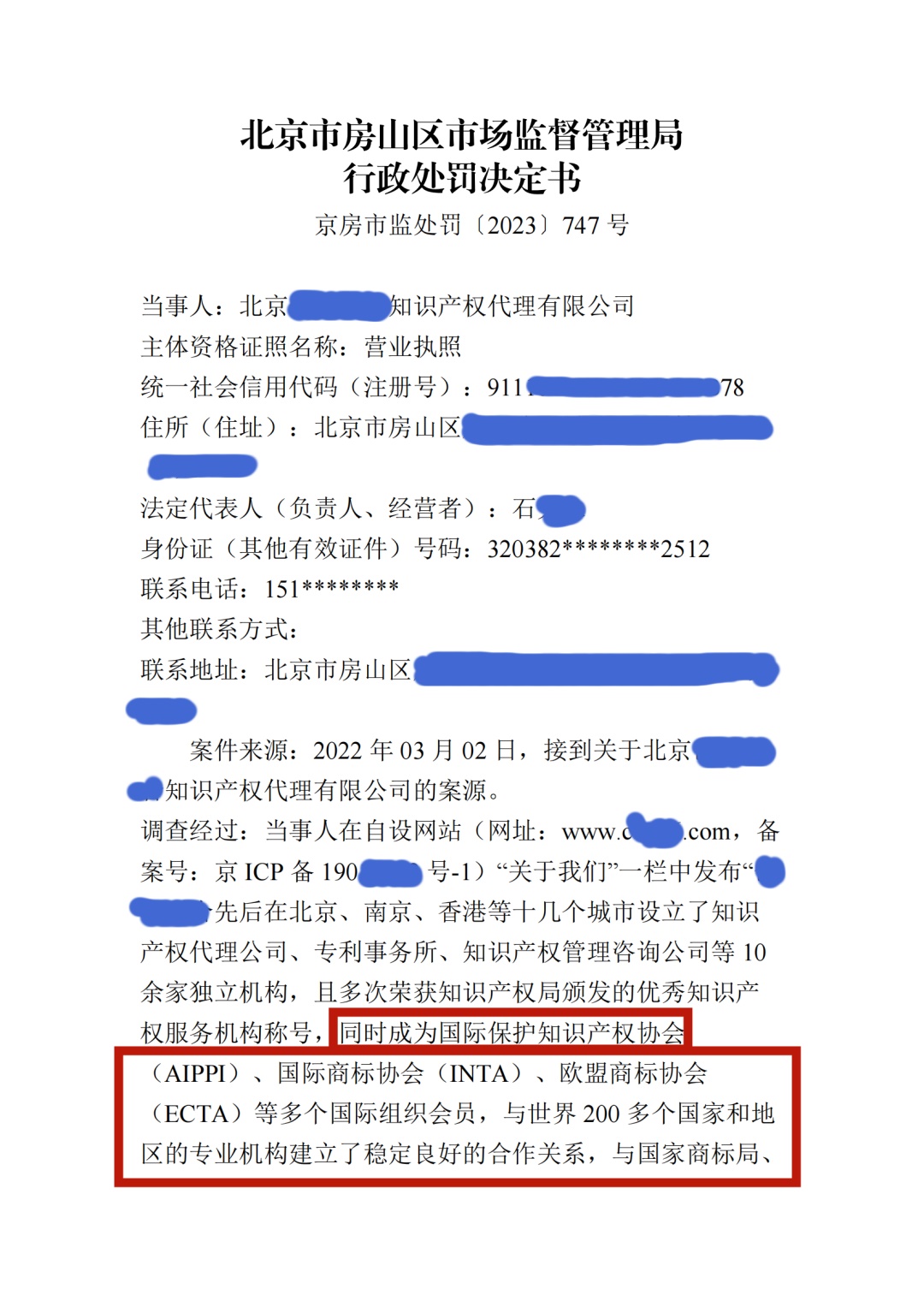 近日,北京市企业信用信息网发布了一则处罚信息,北京某知识产权代理机构在自设网站一栏中发布:“公司先后在北京、南京、香港等十几个城市设立了知识产权代理公司、专利事务所、知识产权管理咨询公司等10余家独立机构。且多次荣获知识产权局颁发的优秀知识产权服务机构称号,同时成为国际保护知识产权协会(AIPPI)、国际商标协会(INTA)、欧盟商标协会(ECTA)等多个国际组织会员,与世界200 多个国家和地区的专业机构建立了稳定良好的合作关系,与国家商标局、中国国家专利局、中国科学院、国家科技部、国家商务部一直保持着良好的协作关系”的公司简介和宣传用语与实际情况不符,涉嫌虚假宣传。