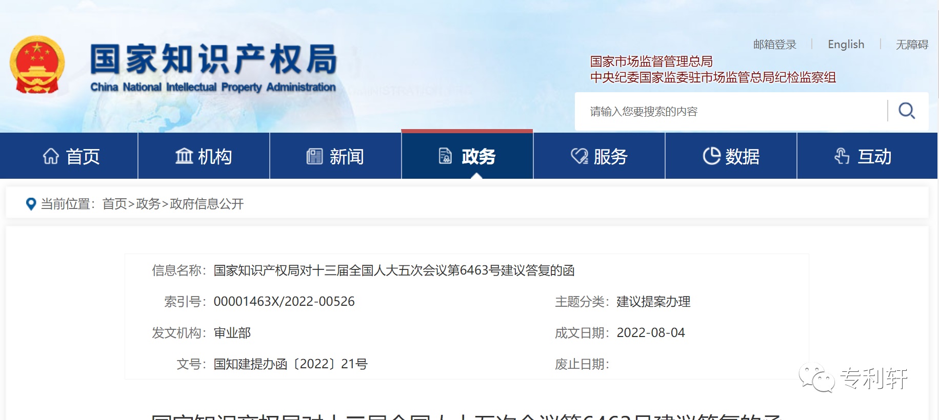 国家知识产权局对十三届全国人大五次会议第6463号建议答复的函