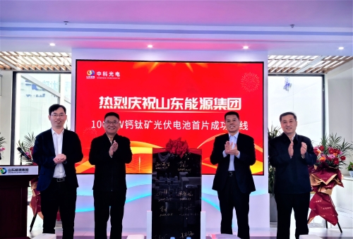 12月31日上午,我省首片大面积单结钙钛矿电池组件,在山东能源集团百兆瓦钙钛矿电池中试产线成功下线。省科技厅党组书记、厅长孙海生,济南市委常委、起步区党工委副书记、管委会主任孙斌,山东能源集团党委书记、董事长李伟出席活动并致辞。