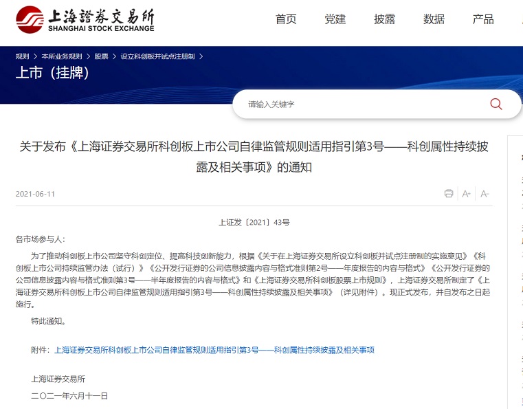 今年6月,上交所还发布了一则“关于发布《上海证券交易所科创板上市公司自律监管规则适用指引第3号——科创属性持续披露及相关事项》的通知”。