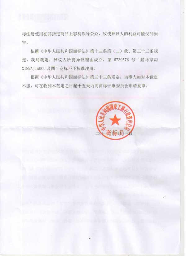 “鑫马家沟xinmajiagou及图”商标异议裁定书