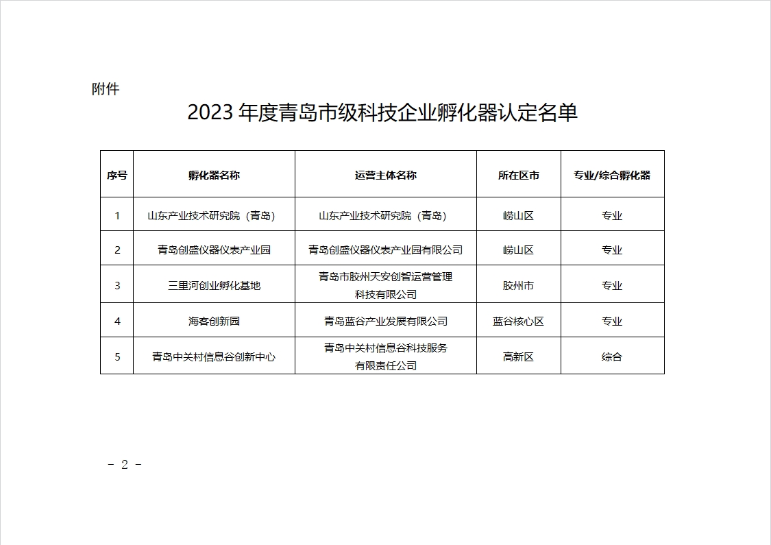 附件:2023年度青岛市级科技企业孵化器认定名单