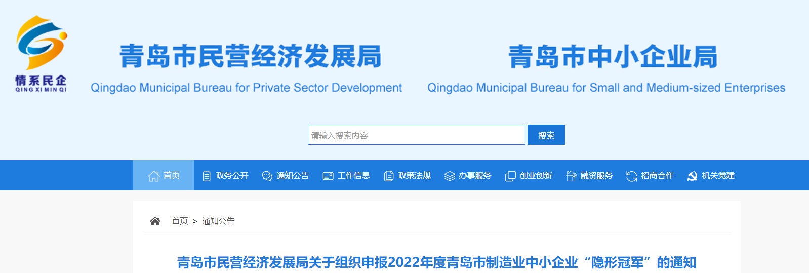 为深入推进实体经济振兴,引导中小企业以“专精特新”为路径、以“隐形冠军”为目标,专注创新和产品质量提升,增强核心竞争力,实现高质量发展,根据《青岛市人民政府印发关于贯彻落实省支持八大发展战略财政政策加快重点产业高质量发展若干政策的通知》(青政字〔2021〕21号)、《青岛市民营经济发展局 青岛市财政局关于印发<青岛市培育和奖励隐形冠军企业、专精特新“小巨人”企业、瞪羚企业、独角兽企业实施方案(2019-2022年)>的通知》(青民发字〔2019〕36号),我局决定开展2022年度青岛市制造业中小企业“隐形冠军”申报工作。现将有关事项通知如下:
